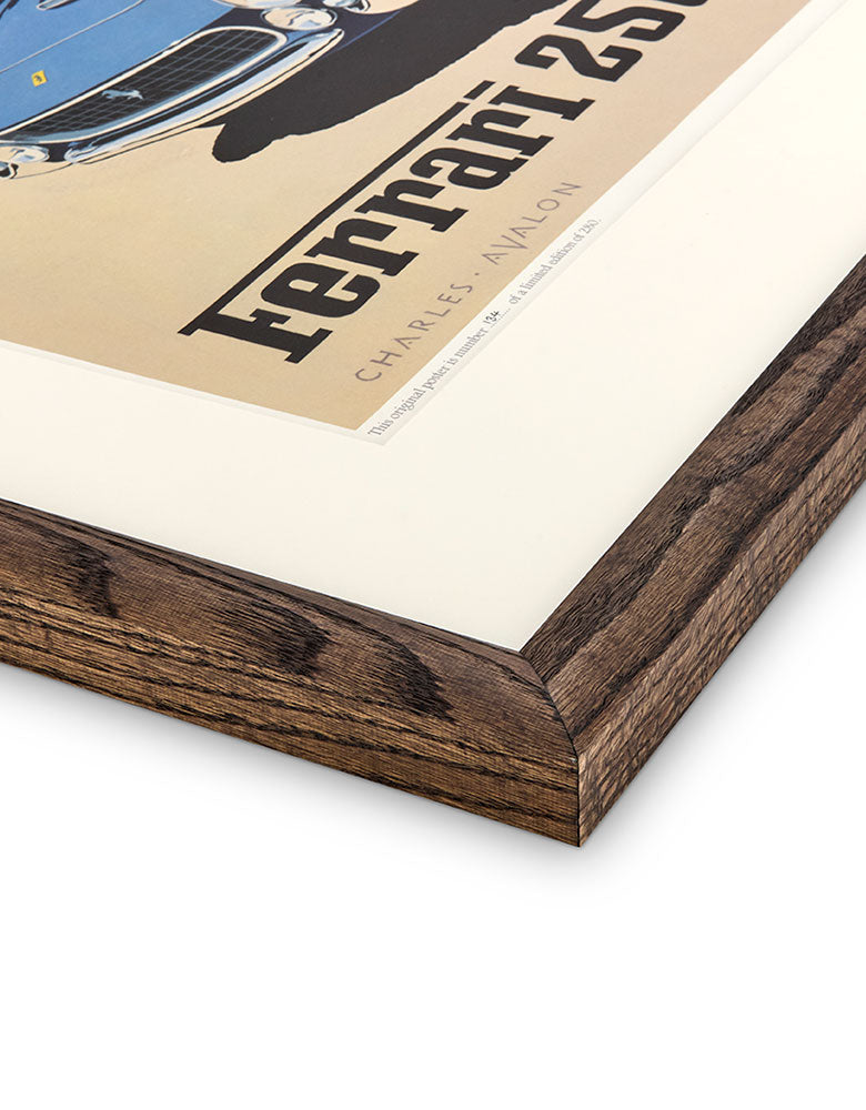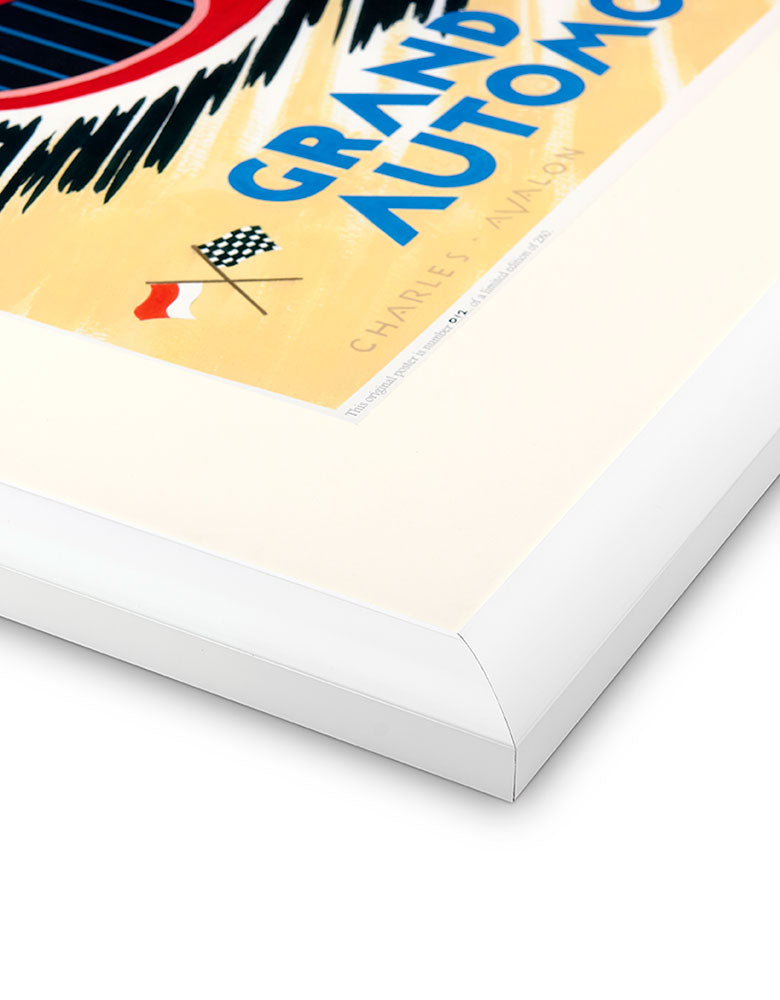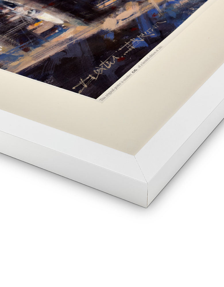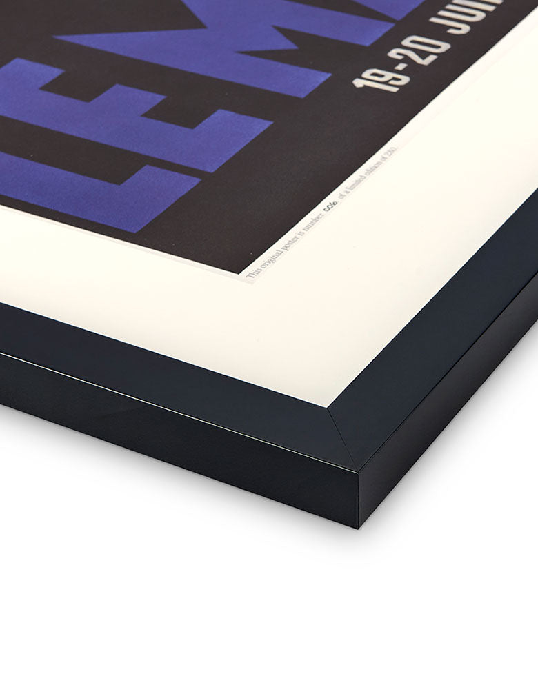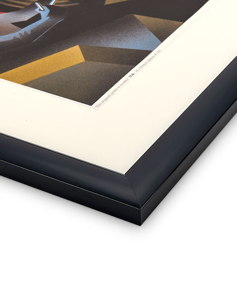 All frames are complemented with a generous 4-ply, acid-free, ivory window-mount, to visually enhance the poster. The frames are completed with a choice of standard glass, UV glass, or premium 'Artglass' to provide both UV protection and an invisible finish.